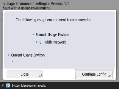 5If the security settings have already been changed by selecting the recommended environment type, the <Usage Environment Settings> screen is displayed. Step