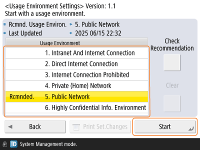 Press <Management Settings> → <Security Settings> → <Recommended Security Set. for Usage Environment>.