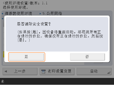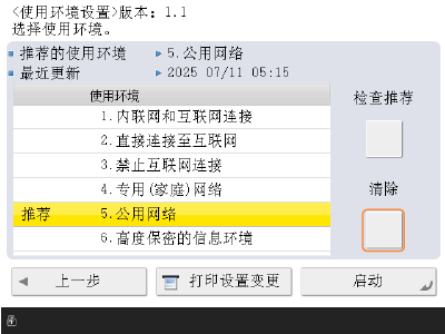 按 <管理设置> → <安全设置> → <使用环境的推荐安全设置>。