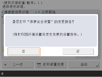 您可以打印使用 <使用环境的推荐安全设置> 更改的设置列表,以检查更改前后的设置值。