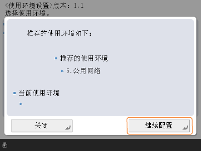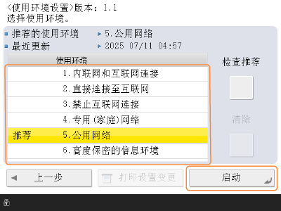 5如果已通过选择推荐的环境类型更改了安全设置,则会显示<使用环境设置>画面。步骤