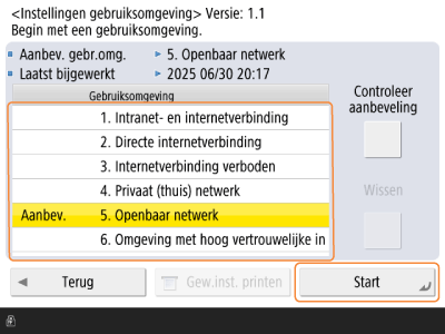 Effect en invloed van beveiligingsinstellingen U kunt de gewijzigde instellingen ook afdrukken om de gewijzigde instellingswaarden te controleren. De instellingen controleren die zijn gewijzigd met de aanbevolen beveiligingsinstellingen |