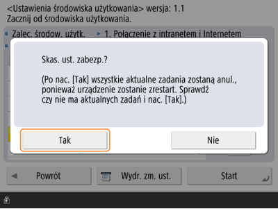 Jeżeli ręcznie zmieniono ustawienia, które zmodyfikowano za pomocą <Zalecane ust. zabezp. dla środowiska użytkowania>, zmiany nie zostaną zachowane. Urządzenie powróci do stanu sprzed wykonania <Zalecane ust. zabezp. dla środowiska użytkowania>.