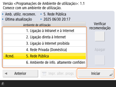 Restaurar as Configurações de Segurança Também pode alterar algumas definições individualmente. Exemplo: Caso alguns serviços e aplicações digitais não possam ser usados, ative a seguinte definição em (Progrs./Gravar).<Preferências> → <Rede> → <Configurações de TCP/IP> → <Configurações de Impressão RAW> * Caso mude para um dos seguintes tipos de ambiente, a definição acima será desativada. 2. Ligação direta à Internet