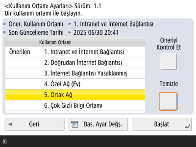 <Yönetim Ayarları> → <Güvenlik Ayarları> → <Kullanım Ortamı İçin Önerilen Güvenlik Ayarları> öğelerine basın.