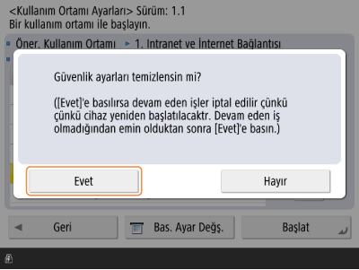 <Kullanım Ortamı İçin Önerilen Güvenlik Ayarları> ile değiştirilen ayarları manuel olarak değiştirdiyseniz değişiklikler korunmaz. Makine, <Kullanım Ortamı İçin Önerilen Güvenlik Ayarları> yapılmadan önceki duruma döner.