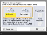 Pour sauter tous les originaux vierges quelles que soient leurs couleurs, sélectionnez <Ttes les coul.>. Pour sauter les originaux vierges uniquement en blanc, sélectionnez <Blanc uniquement>.
