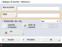 Il n’est pas possible de saisir un objet dans <Objet> lorsque <Boîte fax confidentielle> est sélectionné pour <Destinataire du transfert>. Si aucun objet n'est saisi, l'objet saisi dans <Objet par défaut> est automatiquement défini. <Utiliser le nom de la destination pour l'objet> peut être défini sur <Oui> pour utiliser le nom d'un destinataire enregistré dans le carnet d'adresses comme objet.<Utiliser le nom de la destination pour l'objet> (Ver. 4.02-) |