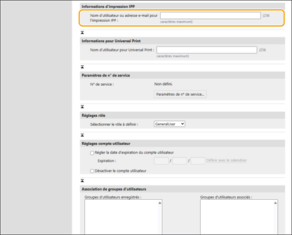 Lors de l'enregistrement des informations utilisateur, vous pouvez désormais définir le nom d'utilisateur ou l'adresse e-mail utilisés pour l'impression IPP.