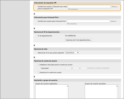 Al registrar la información de usuario, ahora puede establecer el nombre de usuario o la dirección de correo electrónico utilizada para la impresión IPP.