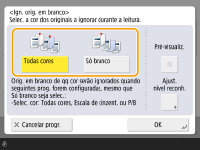 Para pular originais vazios independente da cor, selecione <Todas cores>. Para pular originais vazios apenas em branco, selecione <Só branco>.