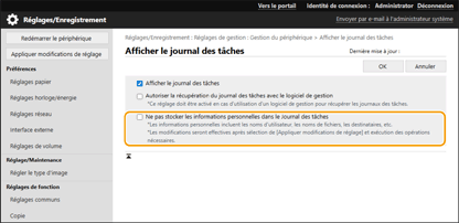 Il est désormais possible d'interdire la saisie d'informations personnelles telles que le nom d'utilisateur, le nom de fichier et la destination dans le journal des tâches et le journal d'audit.