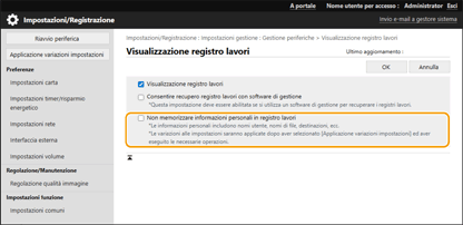 È ora possibile vietare la scrittura di informazioni personali come nome utente, nome file e destinazione nel registro lavori e nel registro di audit.