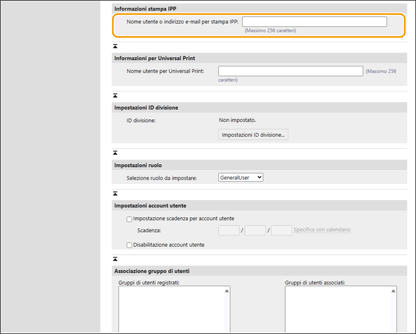 Quando si registrano le informazioni utente, è ora possibile impostare il nome utente o l’indirizzo e-mail utilizzato per la stampa IPP.