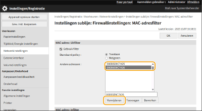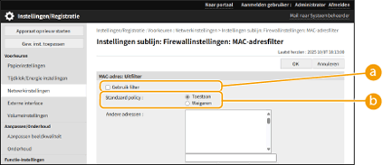 [Standaard policy][Weigeren] | Selecteer om communicatiepakketten alleen toe te laten wanneer ze worden verzonden of ontvangen door apparaten waarvan de MAC-adressen zijn ingevoerd in [Andere adressen]. Communicatie met andere apparaten is verboden. |