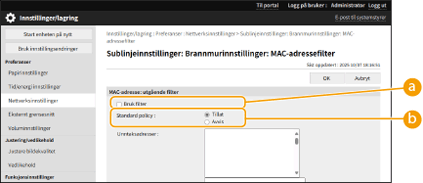 [Standard policy][Avvis] | Trykk for å blokkere kommunikasjonspakker når de sendes til eller mottas fra enheter der MAC-adressene er angitt i [Unntaksadresser]. Kommunikasjon med andre enheter er forbudt. |