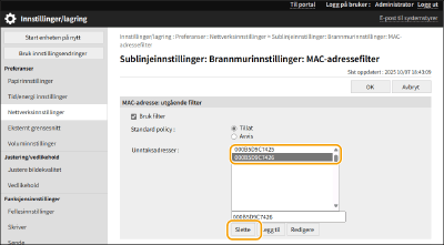 [Tillat] | Trykk for å blokkere kommunikasjonspakker når de sendes til eller mottas fra enheter der MAC-adresser er angitt i [Unntaksadresser]. Kommunikasjon med andre enheter er tillatt. |