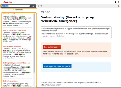 SøkelistesideSøke etter nøkkelordNår du søker ved å skrive inn versjonen som et nøkkelord (dvs. "Ver. 4.02"), vises en liste over sider som inkluderer dette nøkkelordet. Du kan deretter søke gjennom de oppførte sidene. |