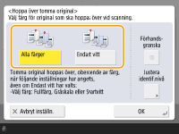 För att hoppa över tomma original oavsett färg, välj <Alla färger>. För att hoppa över tomma original endast i vitt, välj <Endast vitt>.