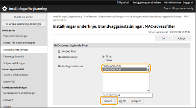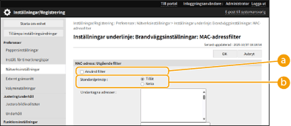 [Standardprincip][Neka] | Välj att endast godkänna kommunikationspaket när de skickas till eller tas emot från enheter vars MAC-adresser anges i [Undantagna adresser]. Kommunikation med andra enheter är förbjuden. |