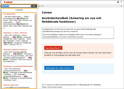 Sida med söklistaSöka efter nyckelordSök genom att ange versionen som nyckelord (t.ex. ”Version 4.02”) visas en lista med sidor som innehåller det sökordet. Du kan sedan leta igenom listade sidor. |