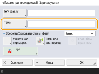 Тему не можна ввести в <Тема>, якщо <Скринька конф. факсів> вибрано для <Адресат переадресації>. Якщо тему не введено, автоматично встановлюється та тема, яку введено в <Тема за замовчуванням>. <Використовувати ім’я адресата для теми> можна встановити на <Увімк.>, щоб використовувати ім’я зареєстрованого в адресній книзі адресата як тему.<Використовувати ім’я адресата для теми> (Вер. 4.02-) |