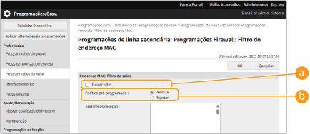 Selecione esta opção para deixar passar pacotes de comunicação apenas quando forem enviados para ou recebidos de dispositivos cujos endereços MAC estejam incluídos em [Endereços exceção]. As comunicações com outros dispositivos são proibidas.