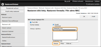 Vyberete-li tuto volbu, pak projdou pouze komunikační pakety, které jsou odeslány nebo přijaty ze zařízení, jejichž adresy MAC jsou uvedeny v seznamu [Adresy s výjimkou]. Komunikace s ostatními zařízeními je zakázána.