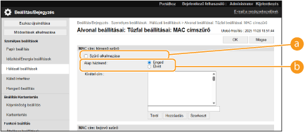 Ha ezt a lehetőséget választja, akkor csak azoknak a kommunikációs csomagoknak a továbbítását engedélyezi, amelyeket a készülék a [Kivétel cím] beállításban megadott MAC-című készülékekre küldött, illetve onnan fogadott. Minden más eszközzel tiltva van a kommunikáció.