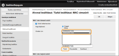 Ha ezt a lehetőséget választja, akkor minden olyan kommunikációs csomag továbbítását letiltja, amelyeket a készülék a [Kivétel cím] beállításban megadott MAC-című készülékekre küldött, illetve onnan fogadott. Minden más eszközzel engedélyezve van a kommunikáció.