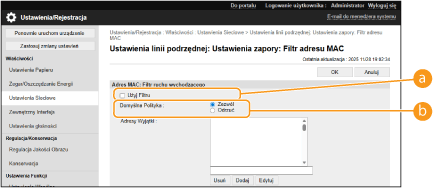 Wybierz tę opcję, aby blokować pakiety danych z odbierane urządzeń o adresach MAC wprowadzonych w polu [Adresy Wyjątki] lub do takich urządzeń wysyłane. Komunikacja z innymi urządzeniami jest dozwolona.
