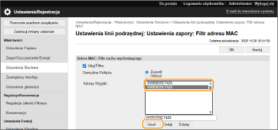 Wybierz tę opcję, aby przepuszczać tylko pakiety danych odbierane z urządzeń o adresach MAC wprowadzonych w polu [Adresy Wyjątki] lub do takich urządzeń wysyłane. Komunikacja z innymi urządzeniami jest zabroniona.