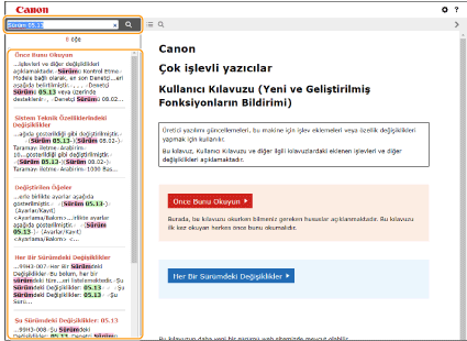 Arama listesi sayfasıHer bir sürümdeki tüm değişikliklerin listelendiği sayfaları aramanıza olanak tanır. Her Sürümdeki Değişiklikler.
