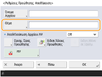 Η επιλογή <Χρήση ονόματος προορισμού για θέμα> μπορεί να οριστεί σε <On> για χρήση του ονόματος ενός προορισμού που έχει καταχωριθεί στο βιβλίο διευθύνσεων ως το θέμα.<Χρήση ονόματος προορισμού για θέμα> (Έκδ. 4.02-)