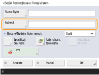 Nu se poate introduce un subiect în <Subiect> când opțiunea <Curier fax confidenţial> este selectată pentru <Destinaţie redirecţionare>.