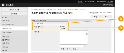 MAC 주소를 잘못 입력한 경우, 리모트 UI에서 기기에 액세스할 수 없습니다. 이러한 경우 조작 패널의 <MAC 주소 필터>에서 <송신 필터>/<수신 필터>에 <필터 사용> ~ <해제>를 설정합니다.