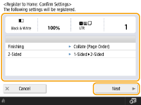 To register a Personal button, you need to log in with personal authentication management. Configuring the Personal Authentication Management Settings If you select <Device Login Authentication Information> for <Information Used for File TX/Browsing Authentication>, a password for a file destination is not stored in a Personal button. <Information Used for File TX/Browsing Authentication> For information on the maximum number of Personal buttons and Shared buttons that can be registered, see Management Functions. Personal buttons cannot be changed to Shared buttons, and vice-versa. To do so, recall the settings and register another button from .Press and hold a button to change its name/comment or move/delete it. The same operations (changing the name/comment of a button or moving/deleting a button) can be performed from on the <Home> screen. Customizing the <Home> ScreenPersonal buttons can be shared between multiple devices by synchronizing personalized data. List of Items That Can Be Personalized Settings that can be registered in Personal buttons/Shared buttonsFunctions and settings that can be registered in Personal buttons/Shared buttons are indicated below. Settings that can be registered in <Favorite Settings> for the <Copy> function Reducing Copying Operations <Fax> function settings of the machine Basic Operations for Sending Faxes Settings that can be registered in <Favorite Settings> for the <Scan and Send> function Useful Scanning Functions Settings that can be registered in <Favorite Settings> for the <Scan and Store> function Setting Screen and Operations for Scanning to Save Save locations for the <Scan and Store> and <Access Stored Files> functions Using Storage Space Shortcuts to the Basic Features screen for the <Fax/I-Fax Inbox> function Access to a server and the login password can be registered to Personal buttons/Shared buttons. This is convenient for skipping password entry when recalling the registered button. If you want to set password in the settings stored in the registered button, as you often import settings in a Personal button or Shared button to another machine and you want to prevent users from pretending to be other users, exclude a password when registering. Importing/exporting the registered buttonsYou can import and export the registered Personal/Shared buttons from the Remote UI. Importing/Exporting All Settings Batch import of Personal buttons/Shared buttons may not be available, depending on the model of the machine to import from. For more information, contact your dealer or service representative. |