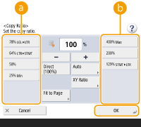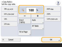 ![]() | You can enlarge or reduce by specifying the copy ratio (%). You can specify the vertical and horizontal ratios individually. Enlarging or Reducing Copies by Specifying the Copy Ratio | |