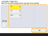 When the screen to select the size of the original is displayedIf <Select Paper> is set to <Auto>, the screen to select the size of the original may be displayed. This is displayed because the size of the original cannot be verified and paper cannot be selected automatically when highly transparent originals, originals with extremely dark base color, or small-size originals are placed. Select the size of the original, or a size close to the original. If <Paper Source Auto Selection> is set to <Off> for a particular paper source, you cannot make copies on paper loaded in that paper source when <Select Paper> is set to <Auto>. <Paper Source Auto Selection> Also, even if <Paper Source Auto Selection> is set to <On> for a paper source, depending on the paper type, automatic paper selection may not be performed. To use paper loaded in a paper drawer for which automatic paper selection cannot be performed, manually specify the paper drawer. |