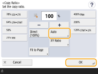 When copying in equal copy ratio to paper that has the same size as the original, the edges of the copied image may be slightly missing. To avoid this, reduce the size of the image by pressing <Copy Ratio> <Fit to Page> to obtain the missing edges of the image.If you select <Fit to Page>, <Shift> is automatically set to <Center>. You cannot scan highly transparent originals, such as transparencies, using the Auto setting for Copy Ratio. Use the Preset Zoom or Zoom by Percentage mode instead. If you set <Auto>, you have to select a paper size manually. If you do not select a paper size, the copy ratio is automatically set to match the size of paper loaded in paper drawer 1. |