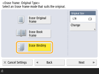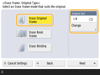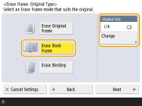 1 | Press <Erase Book Frame> and confirm <Original Size>. ![]() If the size displayed in <Original Size> is different from the size of the book you set, press <Change> to select the size. |