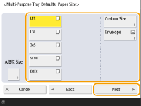 2 | Select the paper size. ![]() ![]() For information on the paper sizes displayed when <Other Size> is pressed, see Available Paper. |