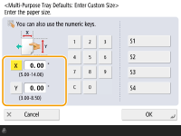 2 | Specify the length of the <X> side and <Y> side. ![]() Press <X> or <Y> to enter the length of each side using the numeric keys. ![]() If you register the paper size you use frequently on buttons <S1> to <S4>, you can call them up with one touch. Registering Free Size Paper (Custom Size Paper) |