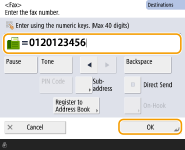 To send faxes overseasEnter the international access number, the country code, and the fax number, in that order. If you cannot successfully connect to the destination overseas, press <Pause> to insert a pause between a number and the next number. To send faxes with a subaddressThe machine supports the use of ITU-T* standard subaddresses. If the recipient's fax machine is compatible with the use of ITU-T subaddresses, you can enhance the confidentiality of sent documents using a subaddress and password. To send a document with a subaddress, enter a fax number, press <Subaddress>, and then enter the subaddress and password. * Stands for International Telecommunication Union-Telecommunication Standardization Sector, which is the group that makes recommendations towards the standardization of worldwide telecommunications. |