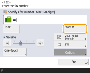 <Manual RX> ![]() | When the call is a fax An incoming call rings. Pick up the handset. If you hear a beep, select (Home) <Fax> <On-Hook> <Start RX> to receive faxes.![]() When the call is a telephone call An incoming call rings. Pick up the handset and start your conversation. ![]() You need to connect your telephone to the machine beforehand. You can set the machine to automatically receive faxes when an incoming call rings within a specified timeframe. <Switch to Auto RX> |