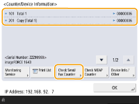 You can also check the counter information for each MEAP. Press <Check MEAP Counter> on the screen in step 2. If you press <Device Info./Other> <Check Device Configuration> on the same screen, you can check the options installed in the machine.