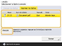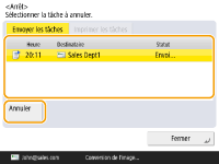 (Stop) sur le panneau de commande alors qu'une tâche d'envoi/d'impression est en cours de traitement et qu'un écran menant à <Envoyer les tâches>/<Imprimer les tâches> est affiché, la tâche d'envoi/d'impression en cours est interrompue, et le message <Envoyer les tâches>/<Imprimer les tâches> s'affiche.