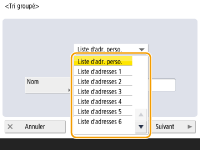 2 | Sélectionnez les destinataires à enregistrer dans un groupe et appuyez sur <OK>. ![]() Liste déroulante des types de destinataireSélectionnez (e-mail), (fax), (I-fax) ou (fichier) pour filtrer les destinataires affichés dans la liste d'adresses ( ). Appuyez sur <Toutes> pour afficher tous les destinataires enregistrés. <Détails/Modification>Sélectionnez un destinataire et appuyez sur <Détails/Modification> si vous voulez vérifier les réglages pour le destinataire. Appuyez sur <OK> pour retourner à l'écran précédent. Liste de destinatairesLes destinataires enregistrés dans la liste d'adresses sélectionnée à l'étape 6 s'affichent. Dans cette liste, sélectionnez les destinataires à enregistrer dans un groupe. ![]() Si les destinataires sont gérés par numéros d'accès, ils ne sont pas affichés dans la liste sauf si vous avez saisi un numéro d'accès dans (Restriction de l'accès aux destinataires enregistrés dans le carnet d'adresses) après avoir appuyé sur <Numéro d'accès>. Bouton Première lettreSélectionnez le bouton alphanumérique pour le premier caractère du nom du destinataire. Appuyez sur <Toutes> pour afficher tous les destinataires enregistrés. <Rechercher par nom>Saisissez le nom du destinataire. Appuyez à nouveau sur <Rechercher par nom> pour retourner à l'écran précédent. |