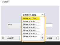 Pour enregistrer un destinataire pour votre propre usage, vous devez vous connecter avec la gestion de l'authentification personnelle. Gestion des utilisateurs La mémorisation/modification/suppression de destinations peut également être effectuée à partir des écrans suivants : <Carnet d'adresses> dans l'écran des fonctions de base du fax Opérations de base pour envoyer des fax<Carnet d'adresses> dans l'écran des fonctions de base de la numérisation Configuration des réglages détaillés lors de l'envoi |