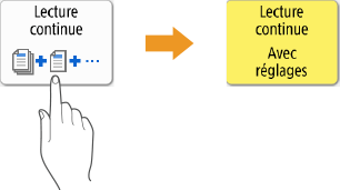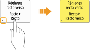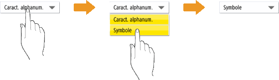 Fonctionnement similaire à celui d'un smartphone (balayage, glisser-déposer)Dans certains écrans, vous pouvez passer d'une page à une autre ou faire défiler l'écran en effectuant un mouvement de balayage avec votre doigt, vers le haut, le bas, la gauche ou la droite, comme vous le feriez avec un smartphone. Vous ne pouvez pas utiliser les commandes par balayage de l'écran et glisser-déposer si l'option <Inverser couleurs écran> est réglée sur <Oui>. <Inverser couleurs écran>Dans les écrans qui comportent des touches mobiles, les touches peuvent être déplacées par glisser-déposer. Parcourir et faire défiler une listeSur certains écrans, le fait de naviguer vers l'extérieur d'une liste fait toujours défiler la liste. |